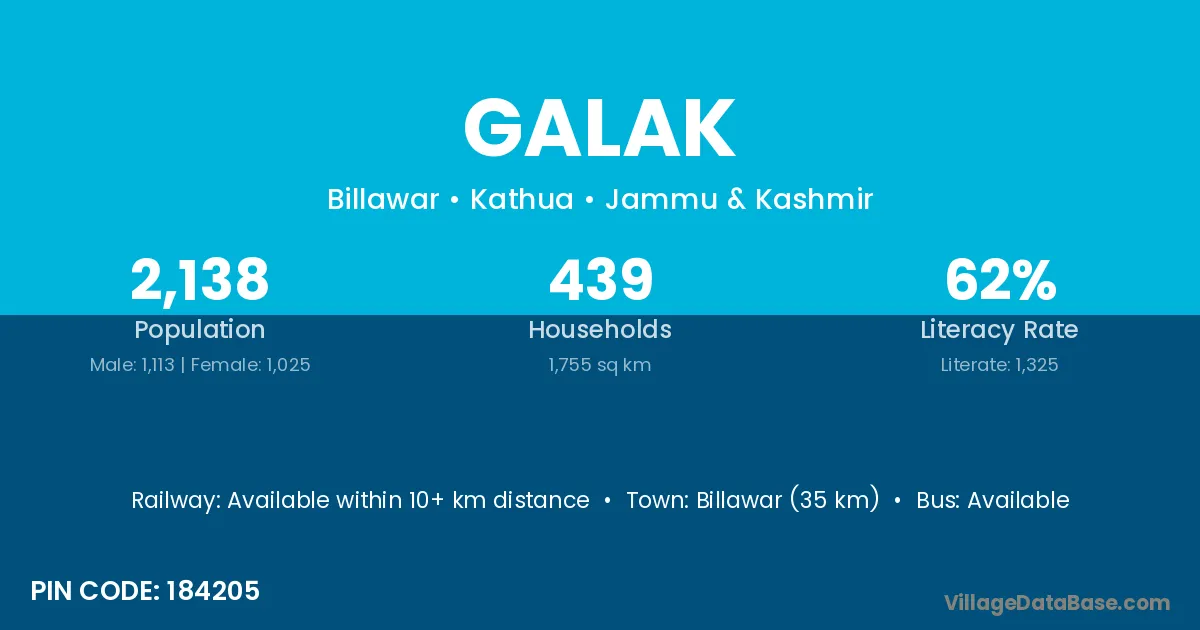 Billawar (35 km) is the nearest town to Galak village for major economic activities and is located approximately 35 km away.