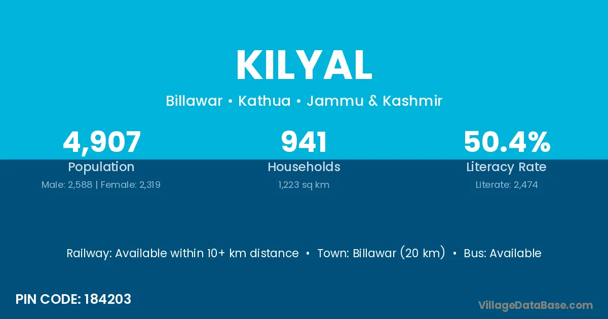 Billawar (20 km) is the nearest town to Kilyal village for major economic activities and is located approximately 20 km away.