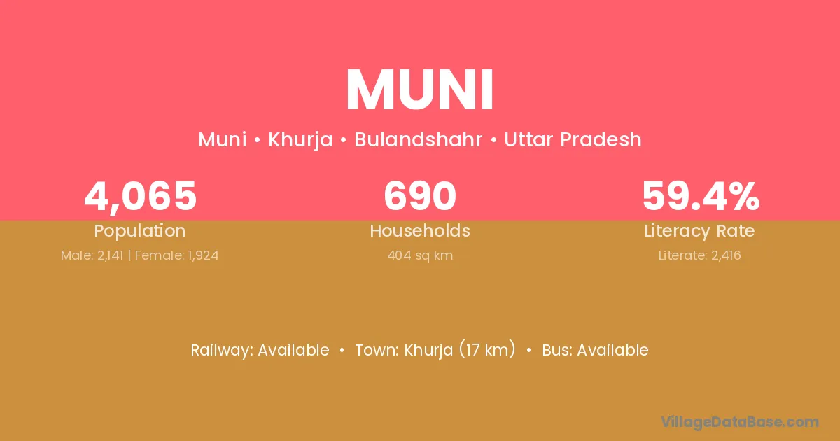 The literacy rate of Muni village is 62.49%. Male literacy stands at 71.64% and female literacy at 51.91%.