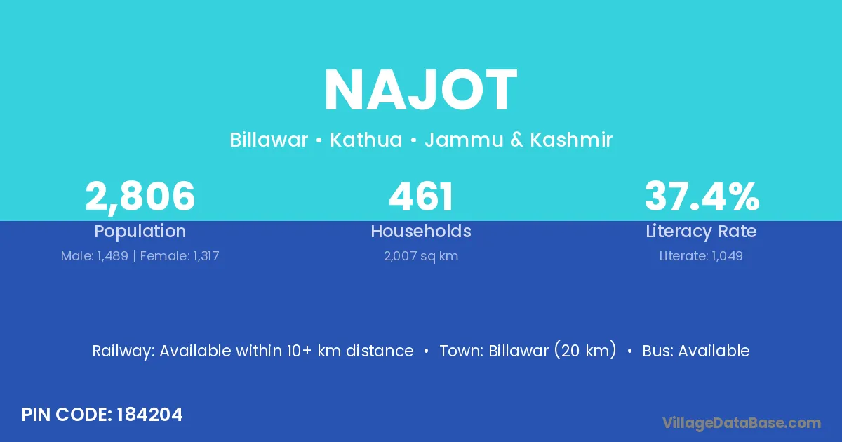 Billawar (20 km) is the nearest town to Najot village for major economic activities and is located approximately 20 km away.