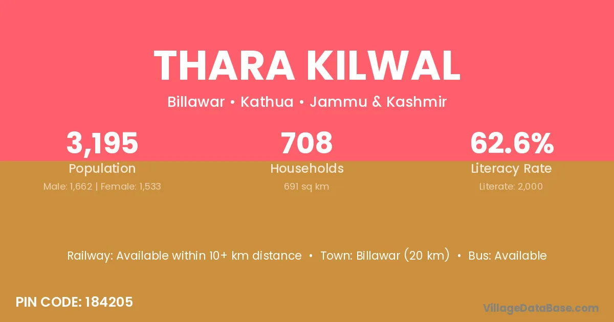 Billawar (20 km) is the nearest town to Thara Kilwal village for major economic activities and is located approximately 20 km away.