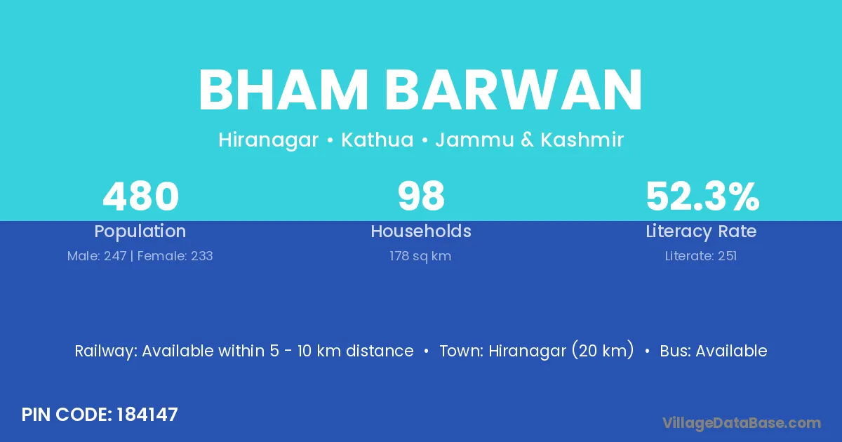 Hiranagar (20 km) is the nearest town to Bham Barwan village for major economic activities and is located approximately 20 km away.