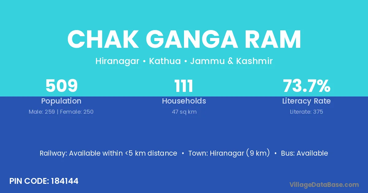 Hiranagar (9 km) is the nearest town to Chak Ganga Ram village for major economic activities and is located approximately 9 km away.