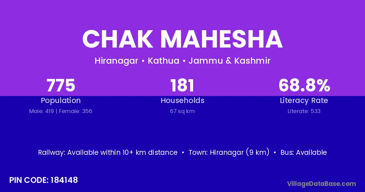Hiranagar (9 km) is the nearest town to Chak Mahesha village for major economic activities and is located approximately 9 km away.