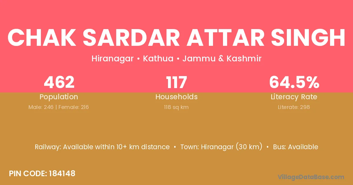 Hiranagar (30 km) is the nearest town to Chak Sardar Attar Singh village for major economic activities and is located approximately 30 km away.