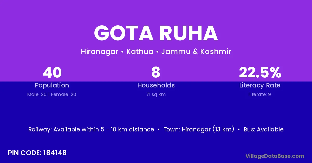 Hiranagar (13 km) is the nearest town to Gota Ruha village for major economic activities and is located approximately 13 km away.