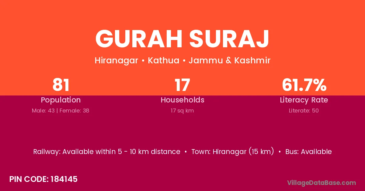 Hiranagar (15 km) is the nearest town to Gurah Suraj village for major economic activities and is located approximately 15 km away.