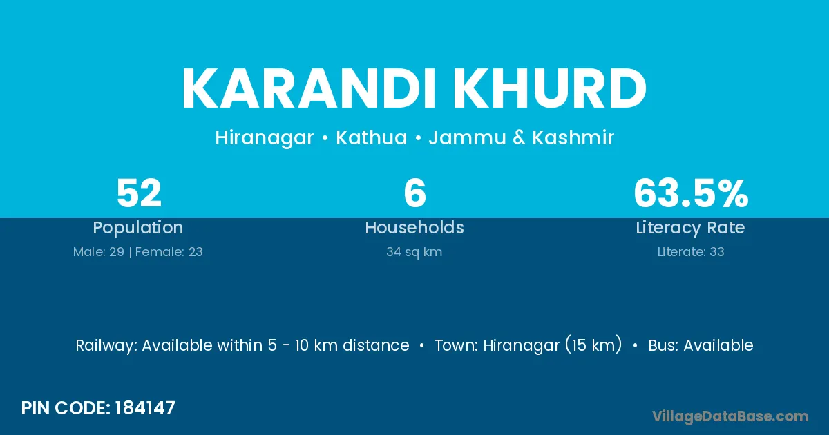 Hiranagar (15 km) is the nearest town to Karandi Khurd village for major economic activities and is located approximately 15 km away.