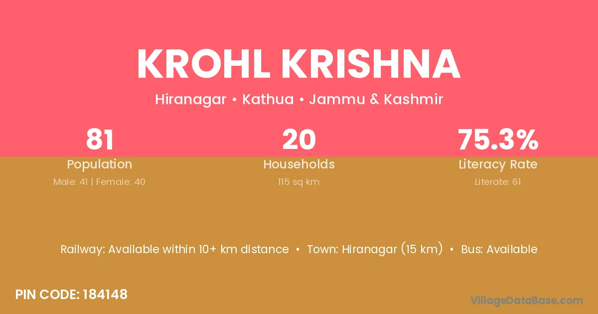 Hiranagar (15 km) is the nearest town to Krohl Krishna village for major economic activities and is located approximately 15 km away.