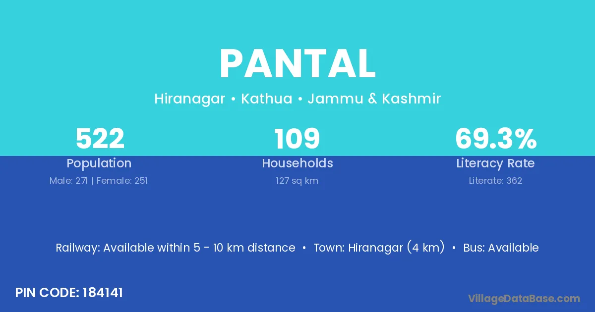 Hiranagar (4 km) is the nearest town to Pantal village for major economic activities and is located approximately 4 km away.