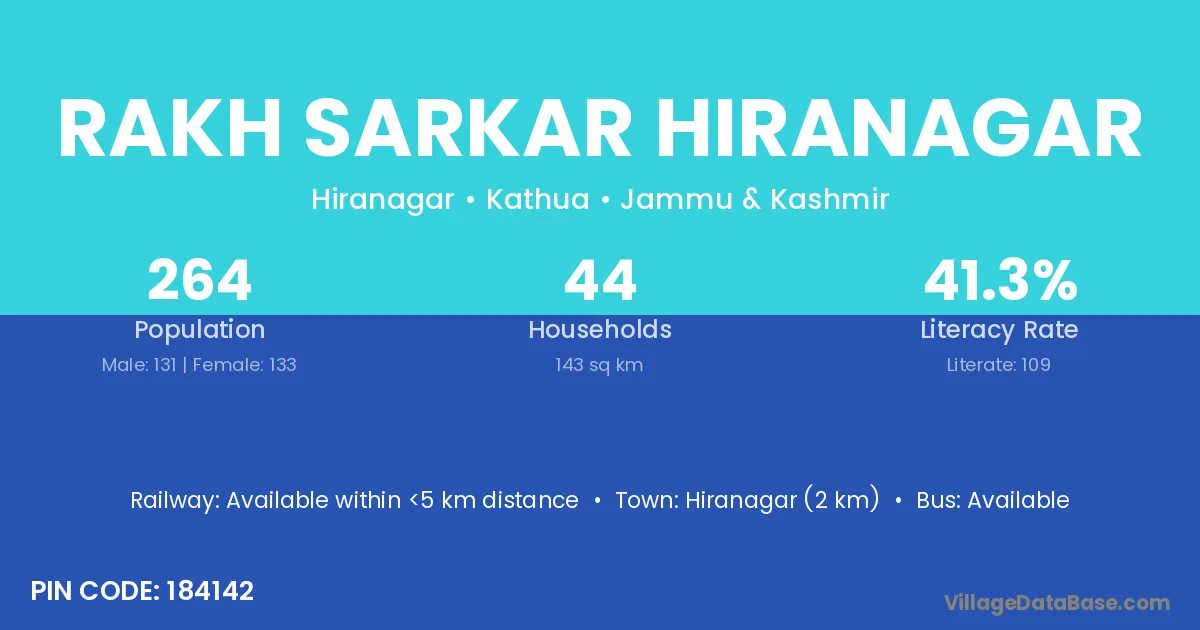 Rakh Sarkar Hiranagar village has a total population of 264 people, of which 131 are males and 133 are females.