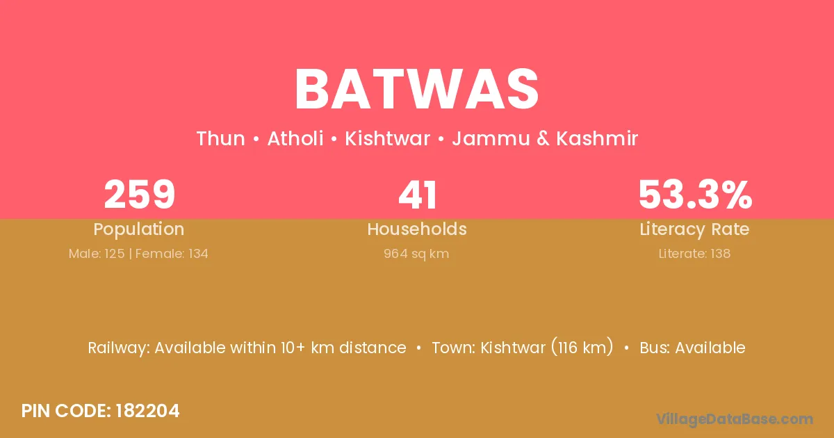 Kishtwar (116 km) is the nearest town to Batwas village for major economic activities and is located approximately 116 km away.