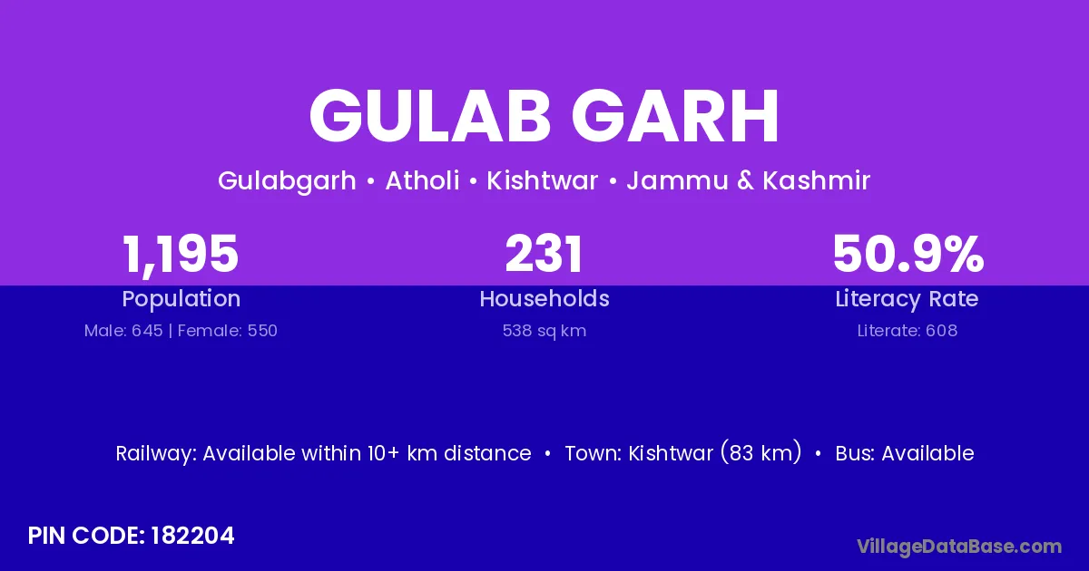 Kishtwar (83 km) is the nearest town to Gulab Garh village for major economic activities and is located approximately 83 km away.