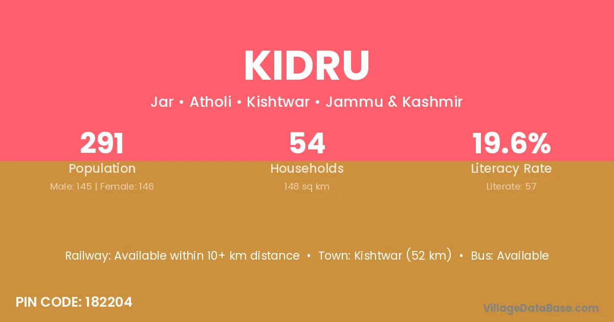 Kishtwar (52 km) is the nearest town to Kidru village for major economic activities and is located approximately 52 km away.