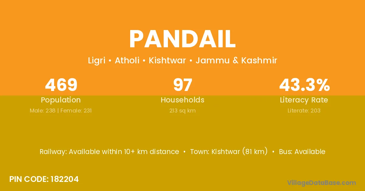 Kishtwar (81 km) is the nearest town to Pandail village for major economic activities and is located approximately 81 km away.