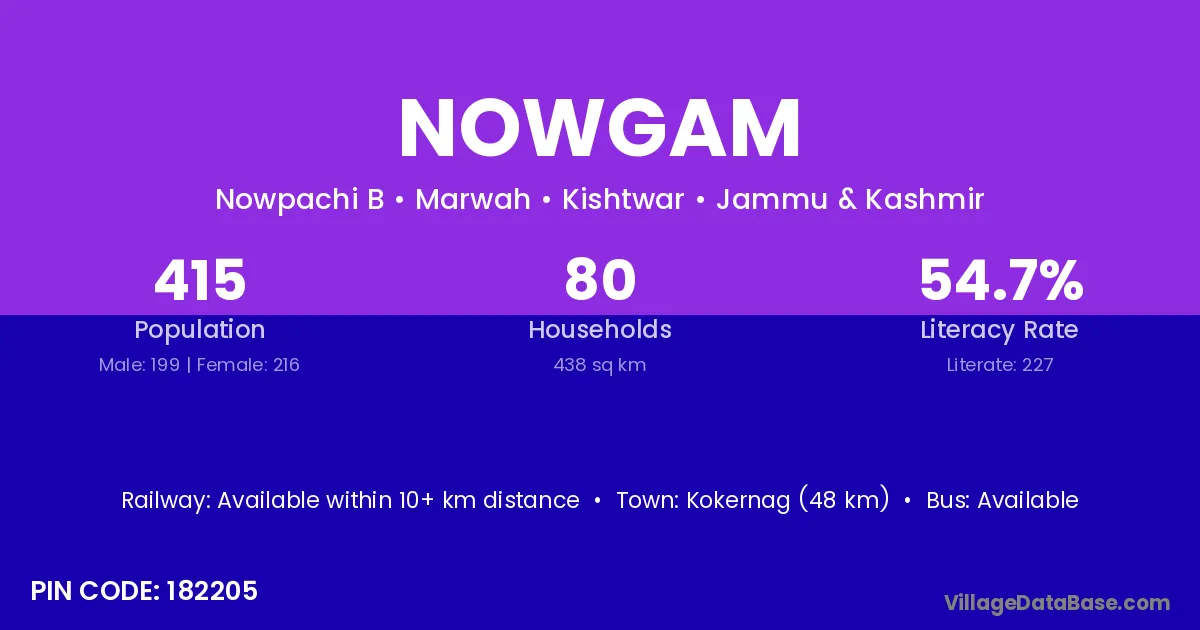Kokernag (48 km) is the nearest town to Nowgam village for major economic activities and is located approximately 48 km away.