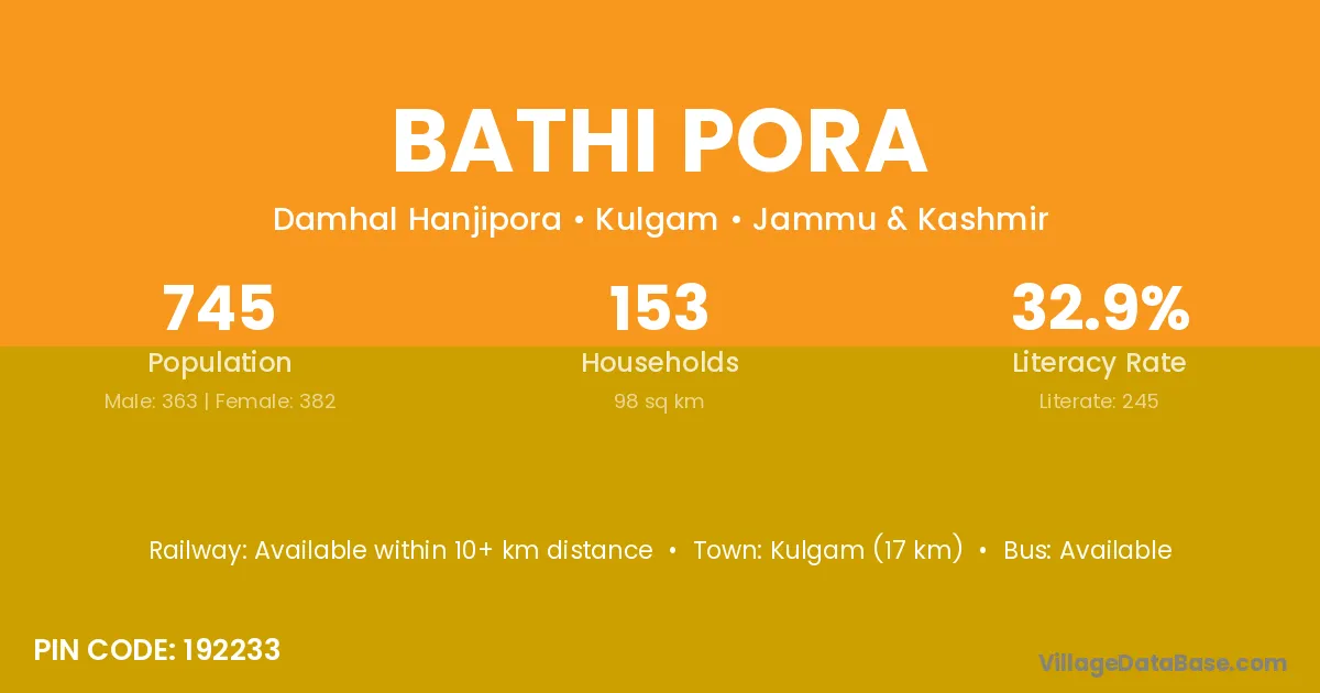 Kulgam (17 km) is the nearest town to Bathi Pora village for major economic activities and is located approximately 17 km away.
