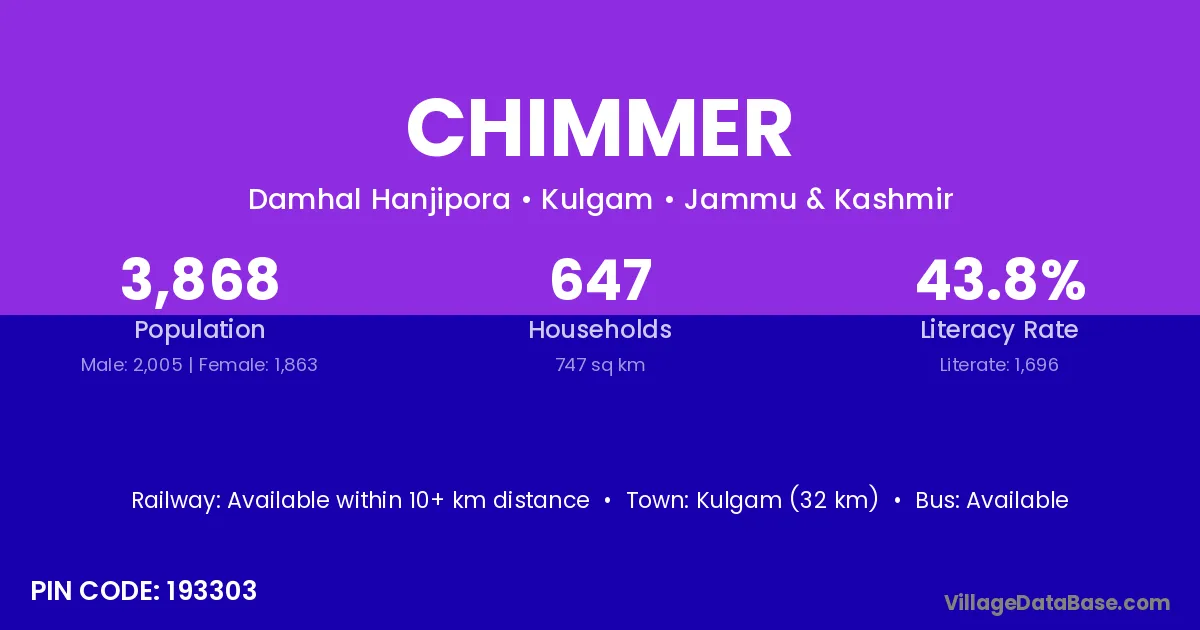 Kulgam (32 km) is the nearest town to Chimmer village for major economic activities and is located approximately 32 km away.