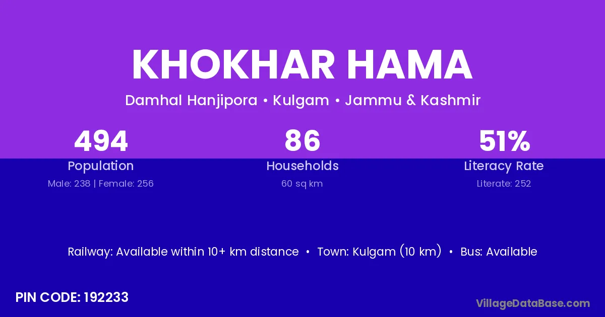 Kulgam (10 km) is the nearest town to Khokhar Hama village for major economic activities and is located approximately 10 km away.