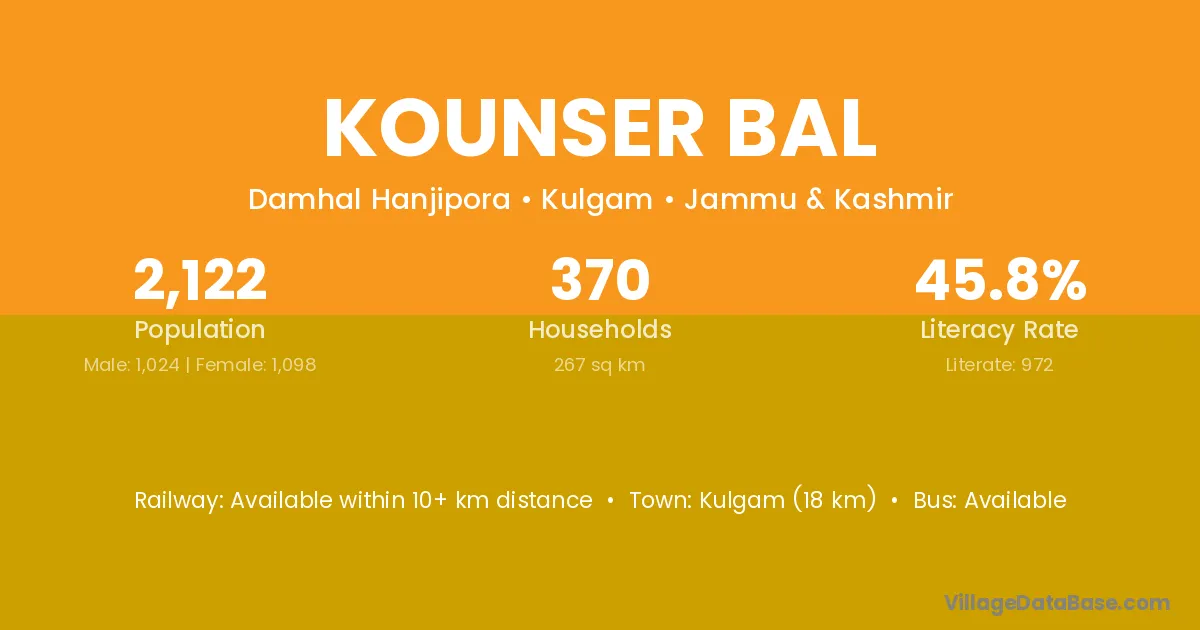 Kounser Bal village has a total population of 2,122 people, of which 1,024 are males and 1,098 are females.