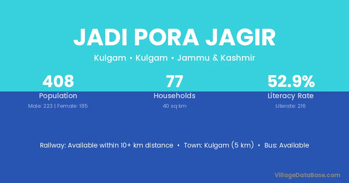 Kulgam (5 km) is the nearest town to Jadi Pora Jagir village for major economic activities and is located approximately 5 km away.