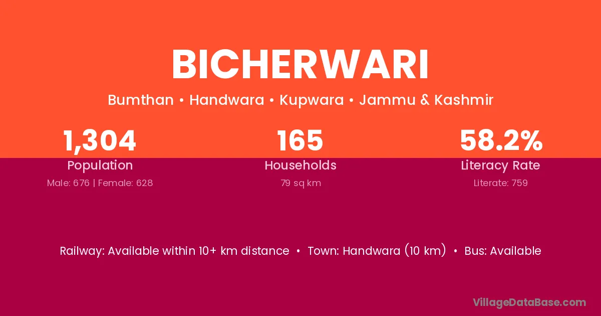 Handwara (10 km) is the nearest town to Bicherwari village for major economic activities and is located approximately 10 km away.