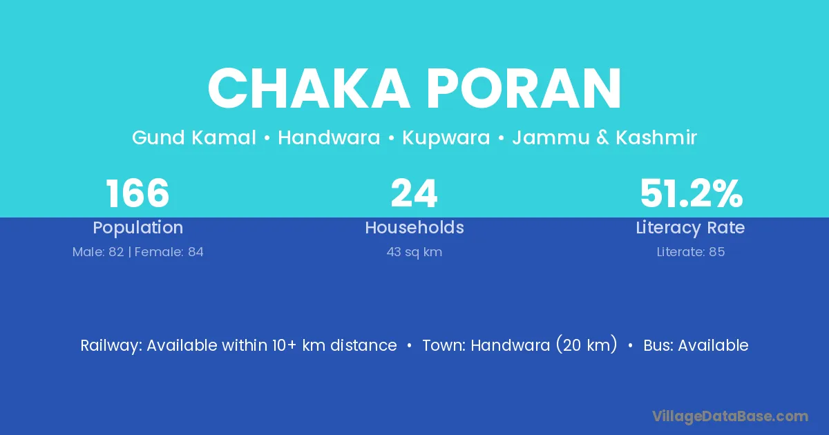 Handwara (20 km) is the nearest town to Chaka Poran village for major economic activities and is located approximately 20 km away.