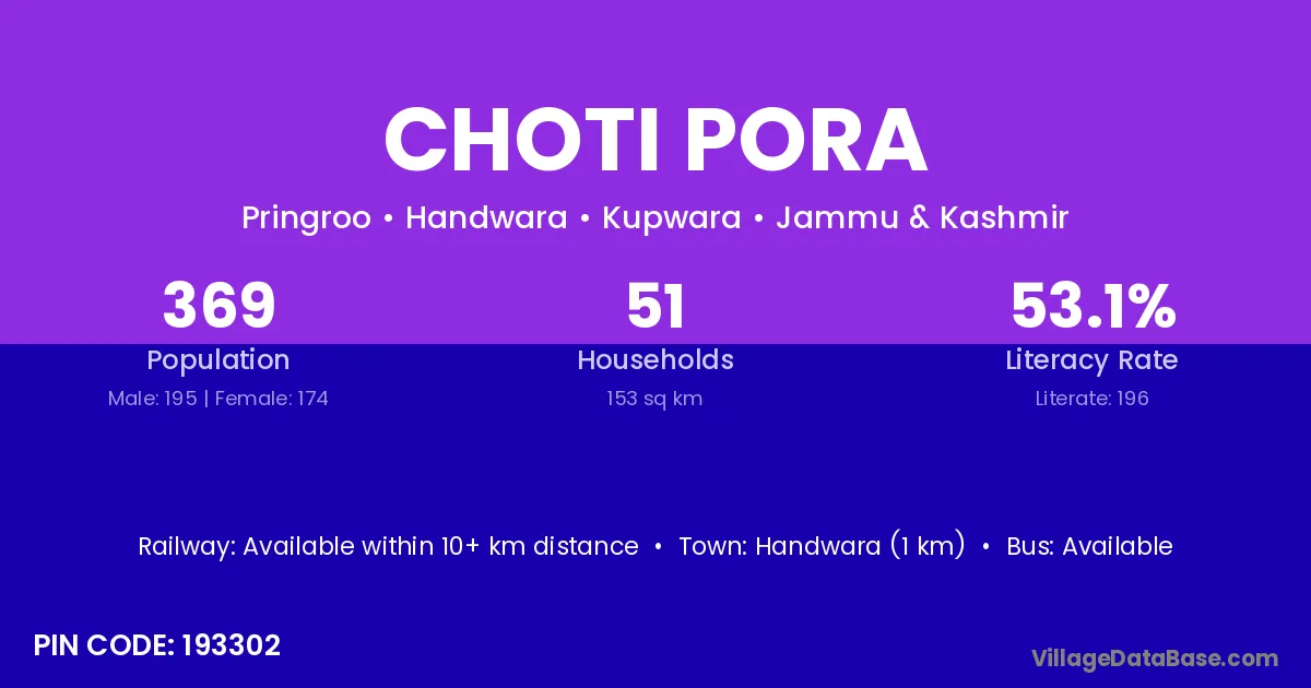 Handwara (1 km) is the nearest town to Choti Pora village for major economic activities and is located approximately 1 km away.