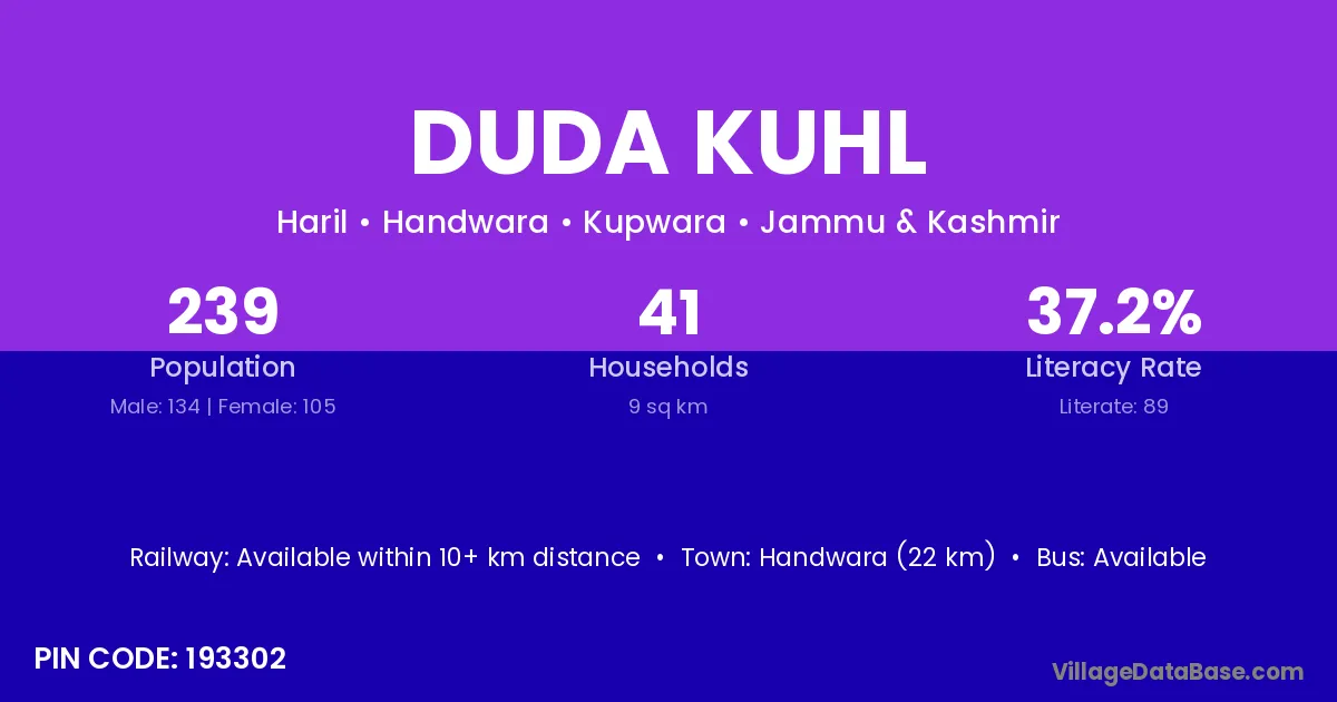 Handwara (22 km) is the nearest town to Duda Kuhl village for major economic activities and is located approximately 22 km away.