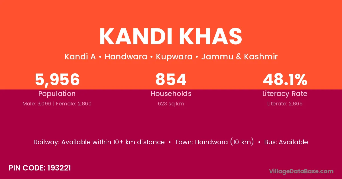Handwara (10 km) is the nearest town to Kandi Khas village for major economic activities and is located approximately 10 km away.