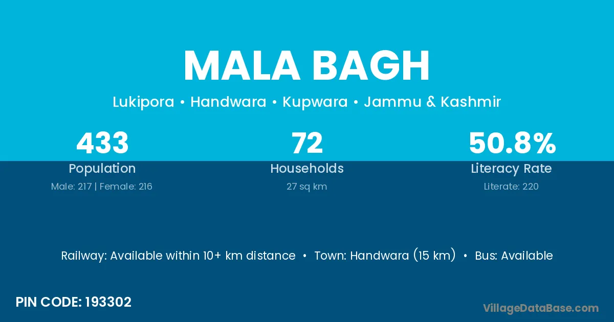 Handwara (15 km) is the nearest town to Mala Bagh village for major economic activities and is located approximately 15 km away.