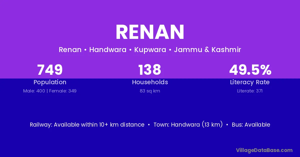 Handwara (13 km) is the nearest town to Renan village for major economic activities and is located approximately 13 km away.