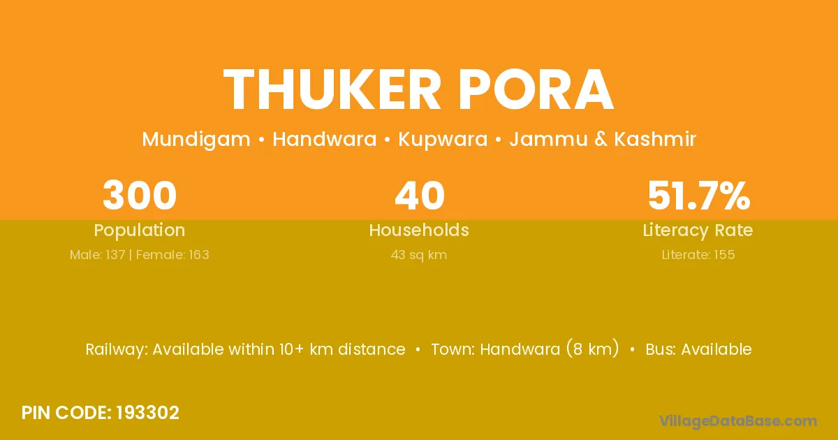 Handwara (8 km) is the nearest town to Thuker Pora village for major economic activities and is located approximately 8 km away.