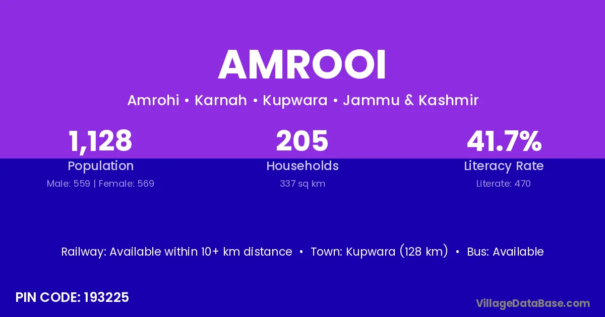 Kupwara (128 km) is the nearest town to Amrooi village for major economic activities and is located approximately 128 km away.