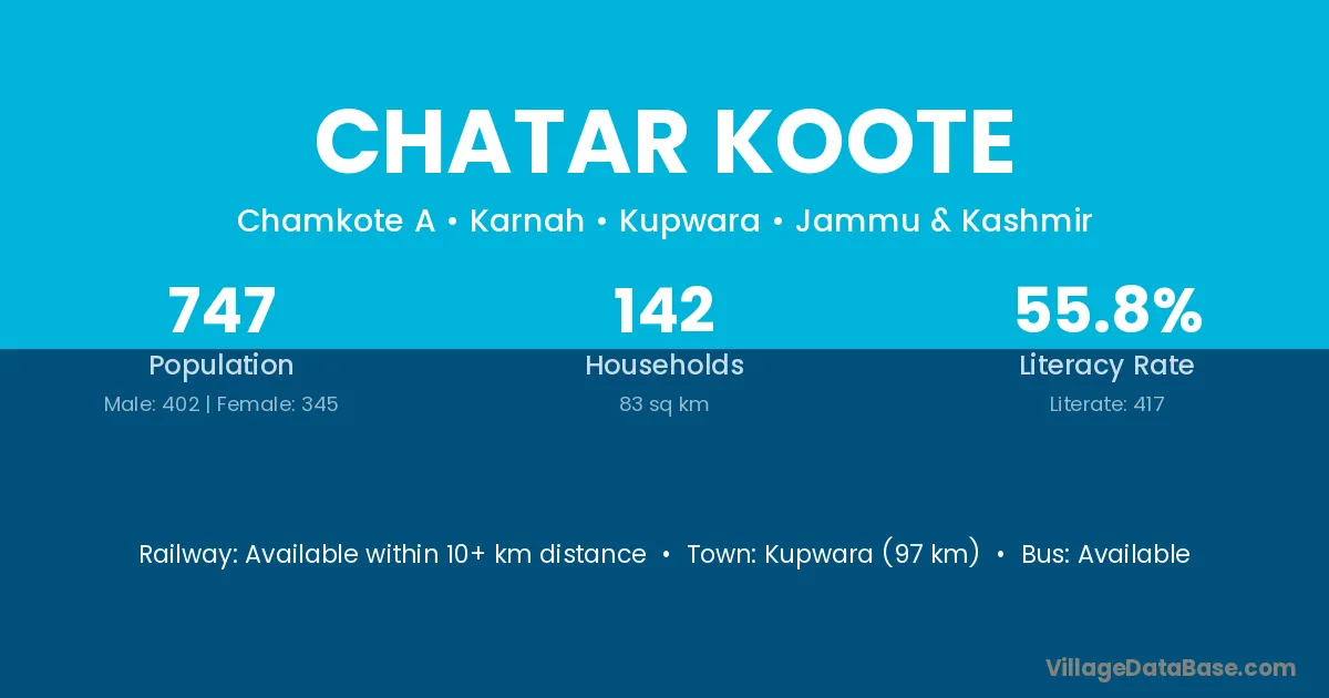 Kupwara (97 km) is the nearest town to Chatar Koote village for major economic activities and is located approximately 97 km away.