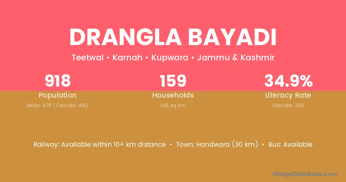 Handwara (30 km) is the nearest town to Drangla Bayadi village for major economic activities and is located approximately 30 km away.