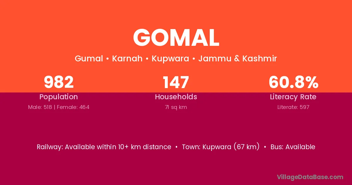 Kupwara (67 km) is the nearest town to Gomal village for major economic activities and is located approximately 67 km away.