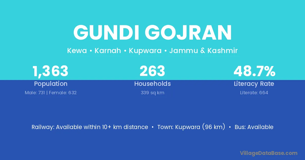 Kupwara (96 km) is the nearest town to Gundi Gojran village for major economic activities and is located approximately 96 km away.