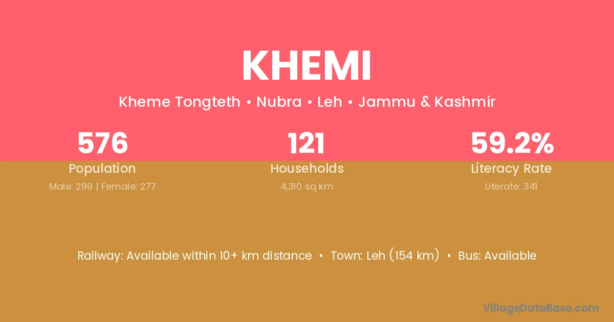 Leh (154 km) is the nearest town to Khemi village for major economic activities and is located approximately 154 km away.