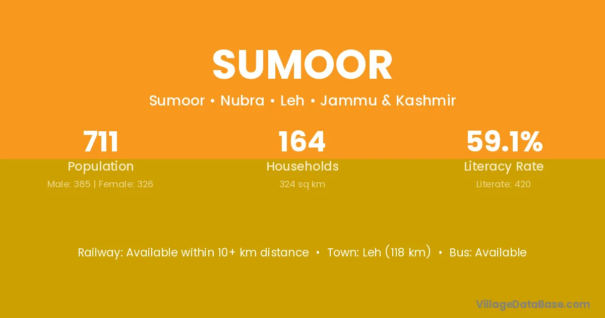 Leh (118 km) is the nearest town to Sumoor village for major economic activities and is located approximately 118 km away.