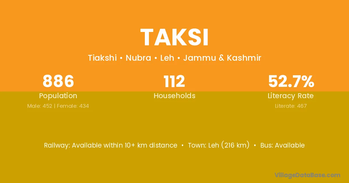 Leh (216 km) is the nearest town to Taksi village for major economic activities and is located approximately 216 km away.