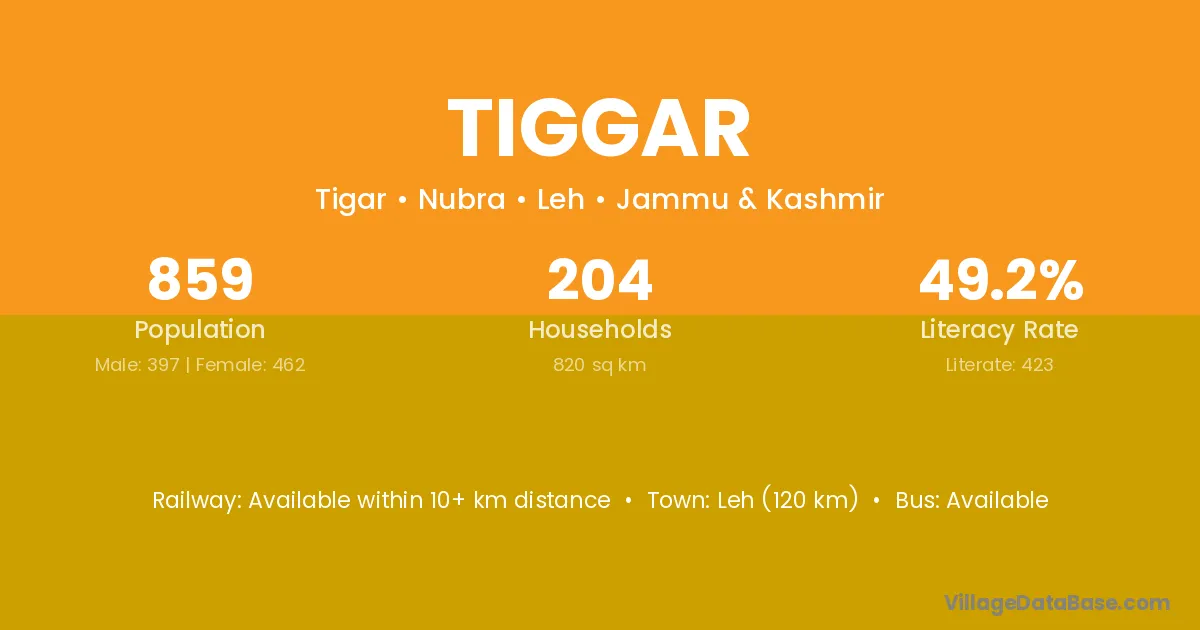 Leh (120 km) is the nearest town to Tiggar village for major economic activities and is located approximately 120 km away.