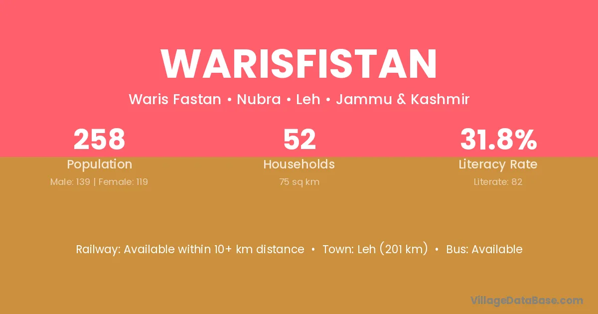 Leh (201 km) is the nearest town to Warisfistan village for major economic activities and is located approximately 201 km away.