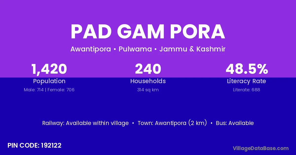 Awantipora (2 km) is the nearest town to Pad Gam Pora village for major economic activities and is located approximately 2 km away.