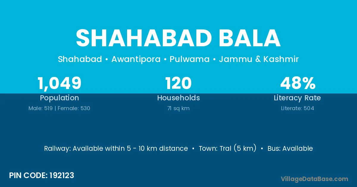 Tral (5 km) is the nearest town to Shahabad Bala village for major economic activities and is located approximately 5 km away.
