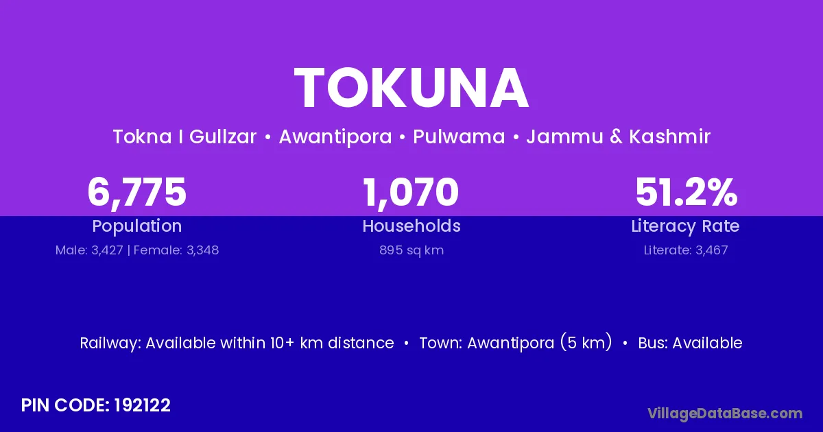 Awantipora (5 km) is the nearest town to Tokuna village for major economic activities and is located approximately 5 km away.