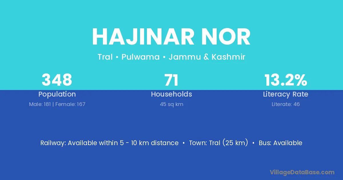 Tral (25 km) is the nearest town to Hajinar Nor village for major economic activities and is located approximately 25 km away.