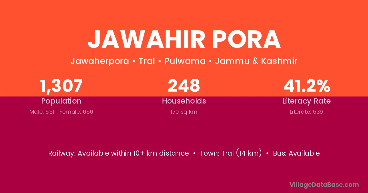 Jawahir Pora village has a total population of 1,307 people, of which 651 are males and 656 are females.