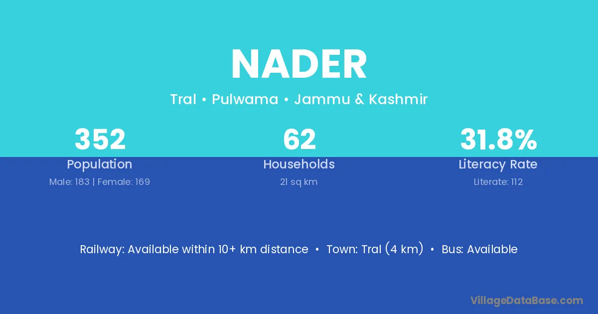 Tral (4 km) is the nearest town to Nader village for major economic activities and is located approximately 4 km away.