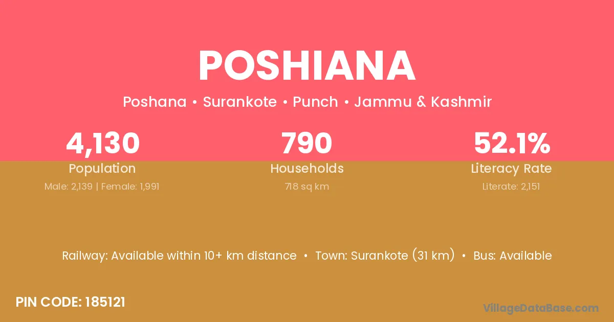 Surankote (31 km) is the nearest town to Poshiana village for major economic activities and is located approximately 31 km away.
